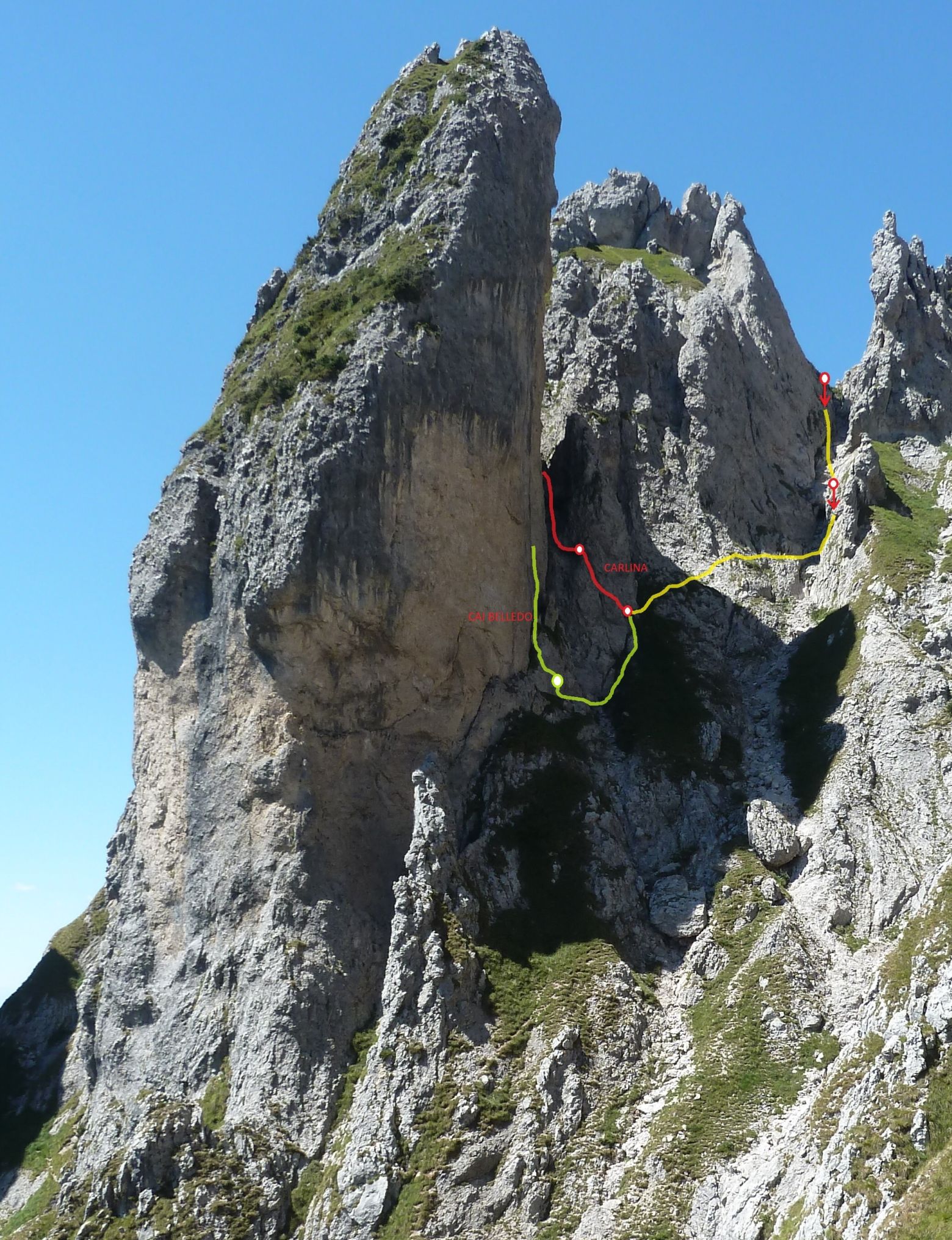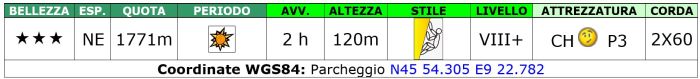 portarsi sotto la parete: S0 su Spit 8mm. 2h Attenzione: avvicinamento su terreno spesso ripidissimo. Discesa: Scendere su zolle per circa 10m (procedere assicurati),